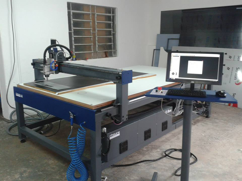 É um recorte computadorizado realizado por uma fresa mecânica seguindo as delineações previamente feitas no computador.